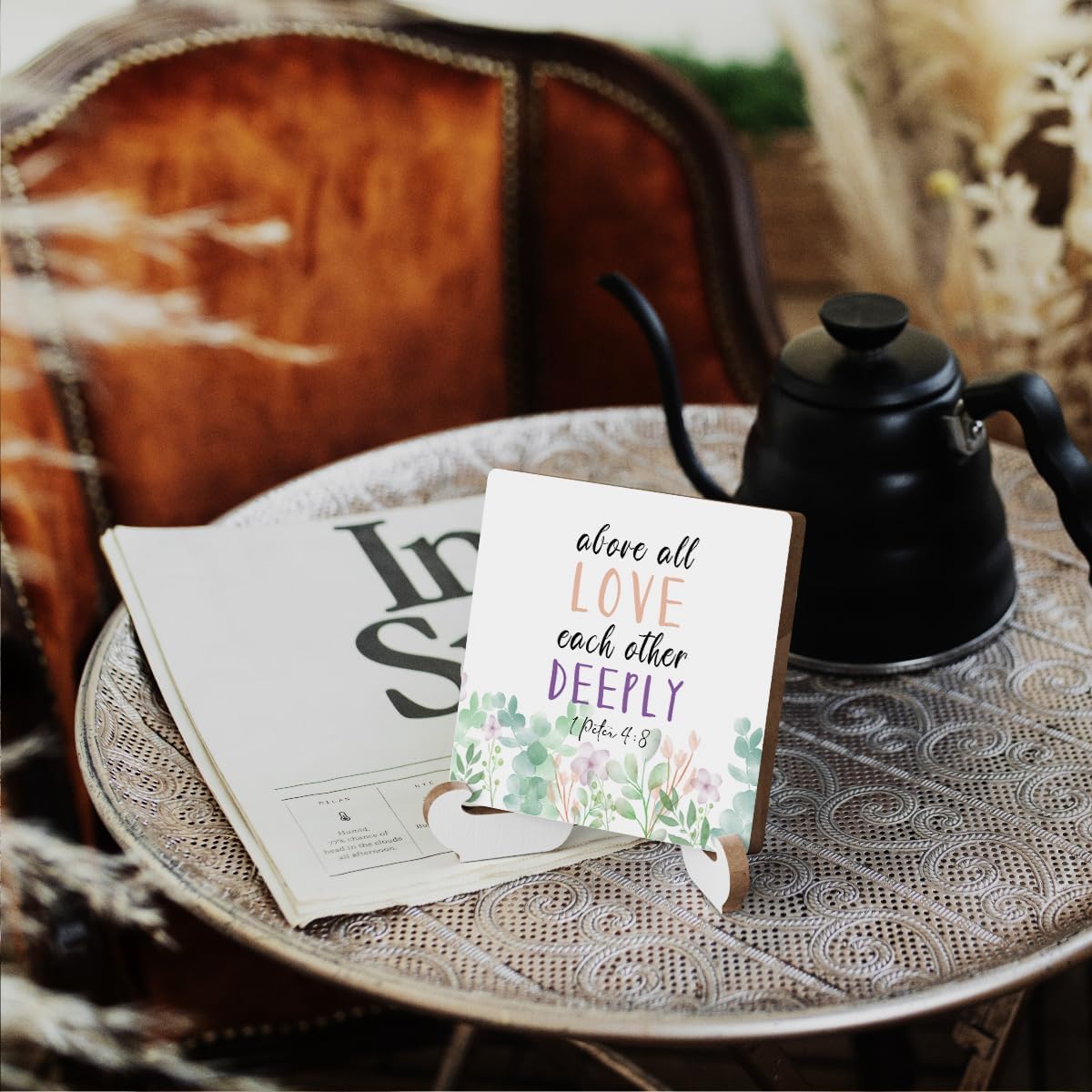 Christian Decor Inspirational Wooden Square Desk Signs, Bible Verses Decor, 1 Peter 4:8 Scripture Decor, Table Desktop Shelf Decorations for Farmhouse Home Porch Office Bedroom, 4 x 4 Inches